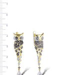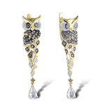 Embrace the wisdom and elegance of nature with these exquisite owl-shaped silver earrings. Crafted with meticulous attention to detail, these earrings feature sparkling brown and white cubic zirconia set against luxurious gold-plated accents. The sophisticated design is completed with a dangling pear-shaped zirconia for an added touch of glamour.
